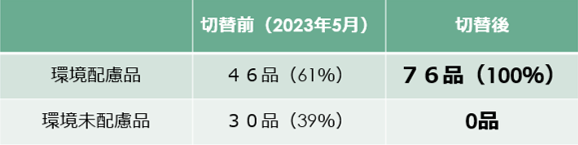 省資源への取り組みの一環として、事業所内で使用している日用品や文房具類を、社員から環境に配慮した商品に切り替える取り組みの提案があり、5月から環境配慮品へ徐々に切り替え、2月に100%切替が完了しました。