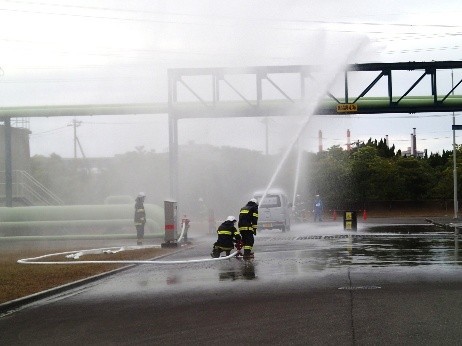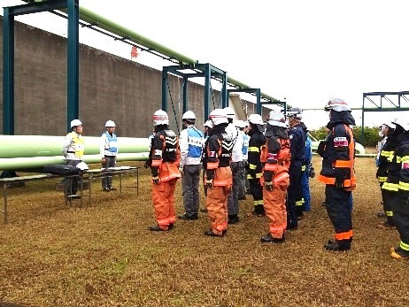 訓練では、通報や避難指示の初動対応から現場対応、関係各所への連絡等の一連の対応と、自衛防災組織と共同防災組織との連携を確認しました。