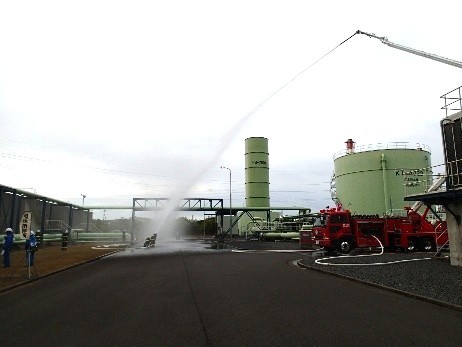 今年度は、「国備バルク貯槽へLPG充填中に貯槽側ホース接続部よりプロパンが漏洩、その後何らかの原因で着火し火災が発生した」との想定で、鹿島共備自衛防災組織と鹿島東部コンビナート共同防災組織 共同鹿石隊の2隊合同で訓練を実施しました。